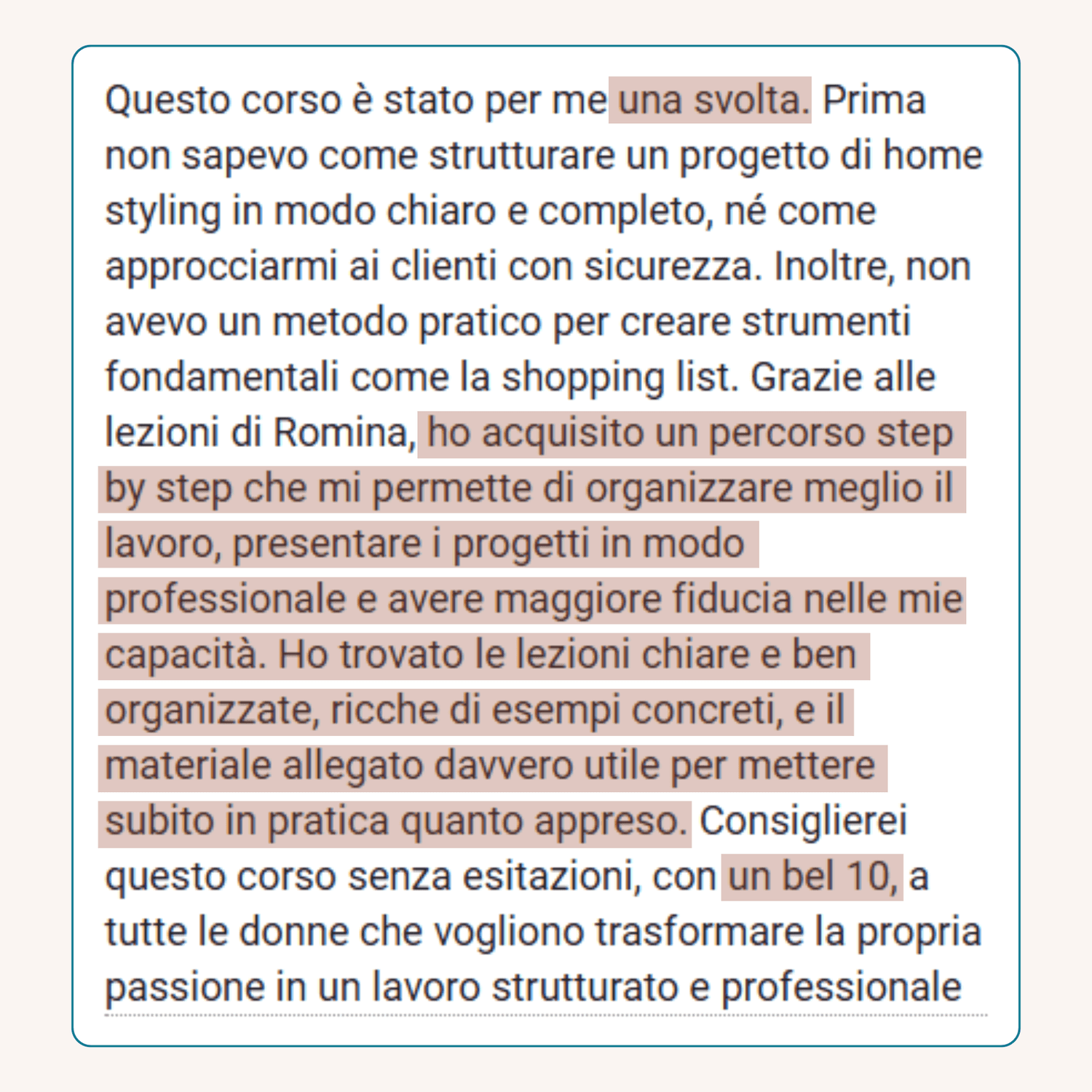 E se hai paura di fare il primo passo senza un supporto individuale, non preoccuparti: Pacchetto Servizio di Home Styling è pensato proprio per darti la possibilità di iniziare a imparare subito, senza l’impegno delle consulenze 1:1.