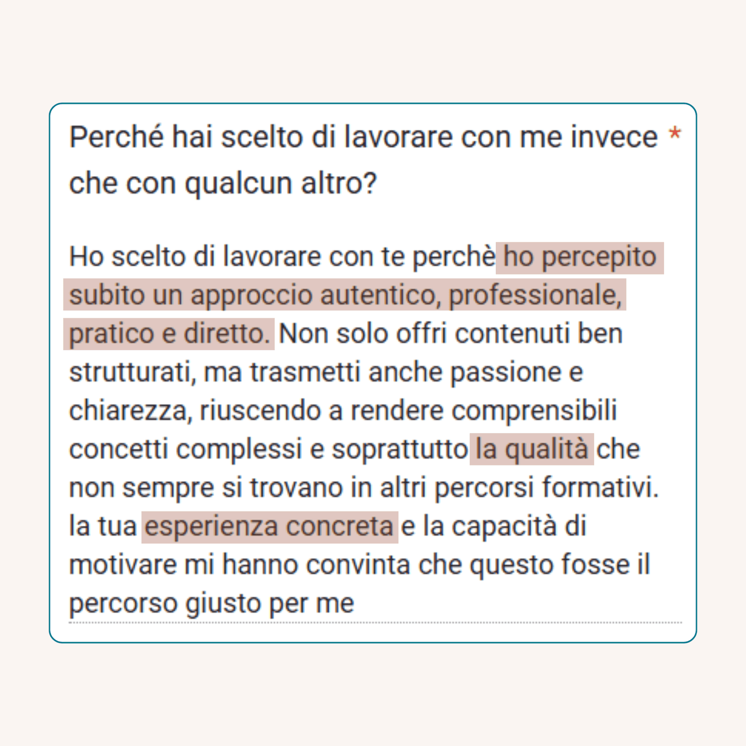 Questi feedback mi ha fatto capire quanto sia importante per me che tu possa apprendere in modo facile e diretto, senza fronzoli, per poter applicare subito ciò che impari.